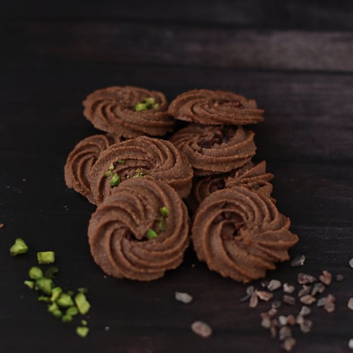 フランスヴァローナココアと発酵バターの香り広がるヴィエノワに、カカオニブとピスタチオをトッピングした2種類を味わえます
