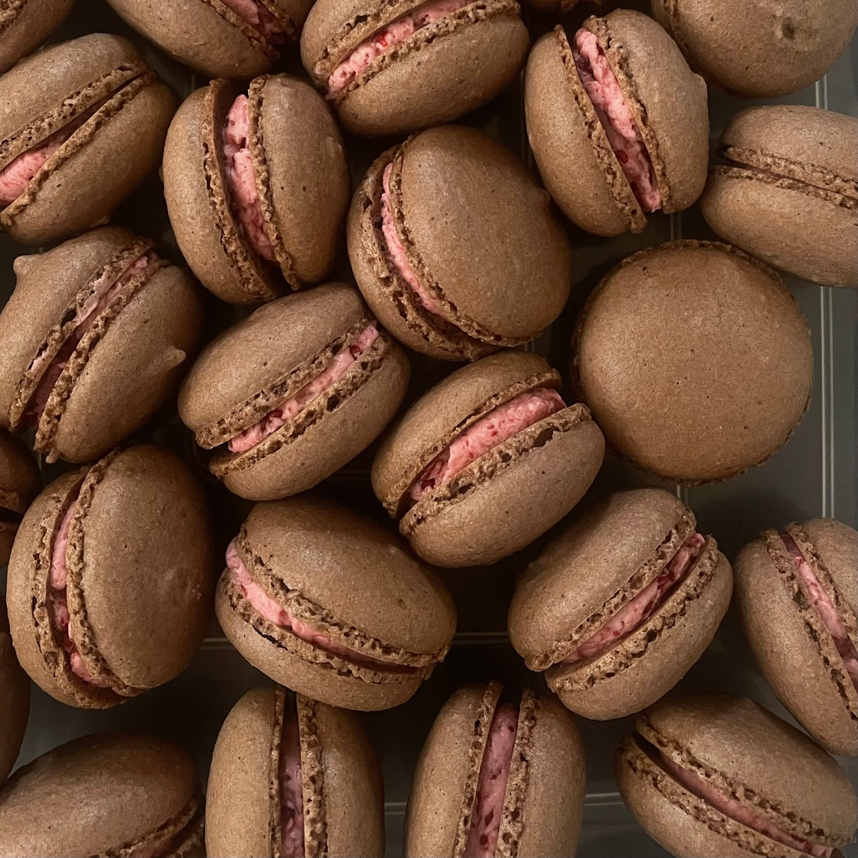 チョコとフランボワーズのコクと酸味が合わさった組み合わせ。甘酸っぱいバタークリームが人気のマカロン