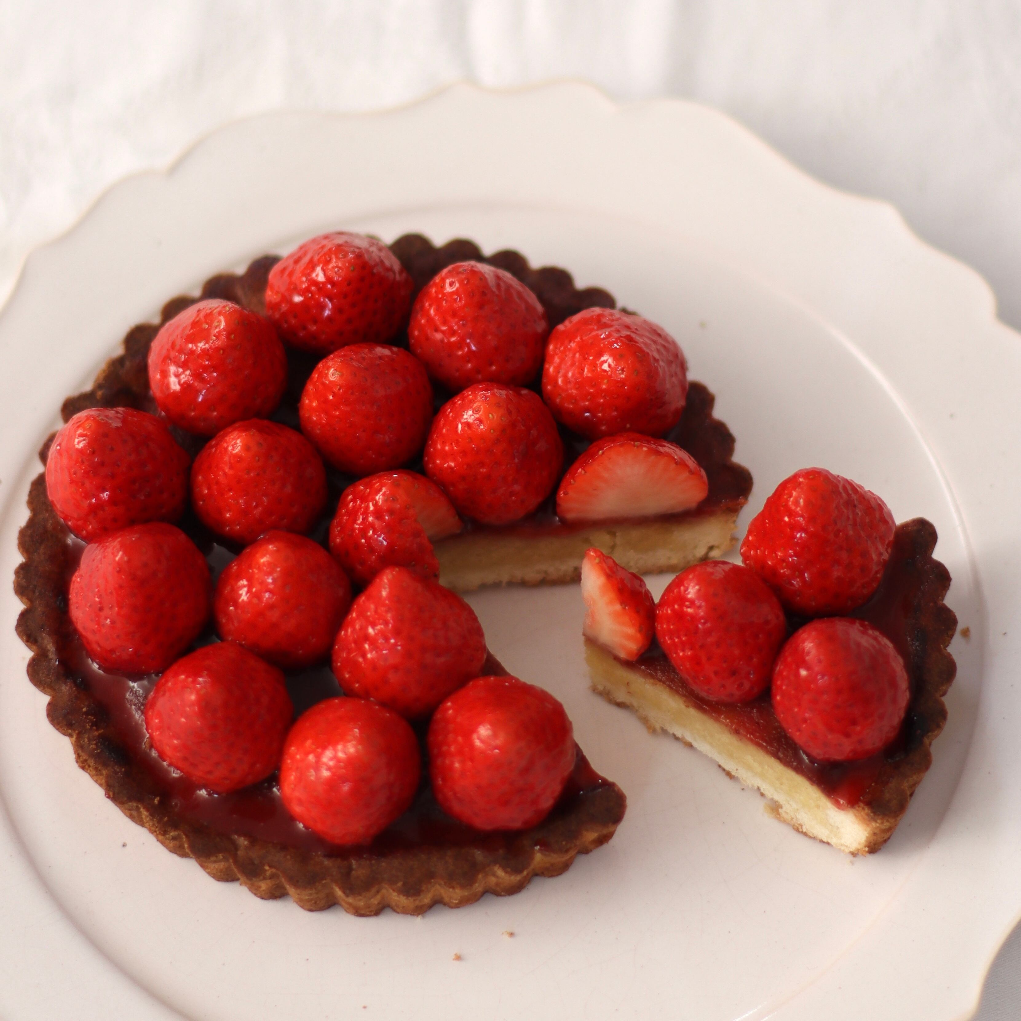 香り高いクレームダマンドに苺のジュレをしみこませた。ジューシーなタルト
