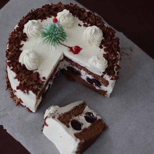 「黒い森」といわれるケーキをクリスマス風に。ダークチェリーのガルニチュールを仕込んだふわふわのチョコレートスポンジ。しっとりしてチェリーのコクがよく合います